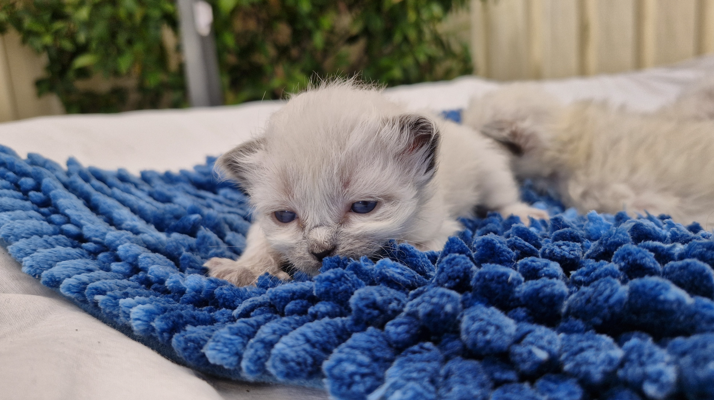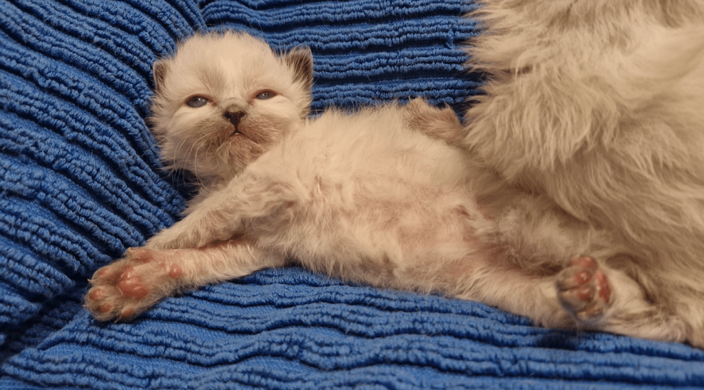 Ragdoll kittens are larger than average so they tend to reach developmental milestones sooner (and if you have a runt they will always take longer, which is fine). The major exception is toileting, because of their fur. It would probably help to trim their butts (with hair-cutting scissors) starting now. I didn’t quite dare to trim ‘my’ Ragdoll litter, and they were still sometimes flinging poo around (unintentionally!) at twelve weeks of age, including getting it on each others’ heads like horrifying little hats.