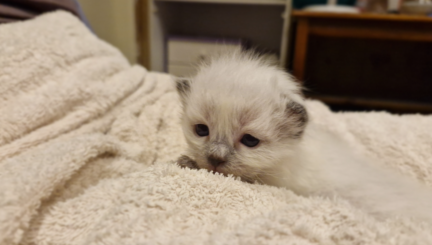 This is the smallest kitten you’d usually see in a photo or on TV. In some ways, this is when they start getting interesting. They’re also less likely to drop dead without warning, although it’s definitely still possible. In humans, medical people often refer to the first three months of life as “fourth trimester” because a human baby is so tiny and fragile. The kitten equivalent is four weeks. They are extremely curious and quite mobile, while also being very small and quite dumb. My quarantine room is the ensuite bathroom in my home, and I never ever let them out unless I’m there to keep track of them. They are still extremely sensitive to cold and noise, and either could kill them shockingly quickly.