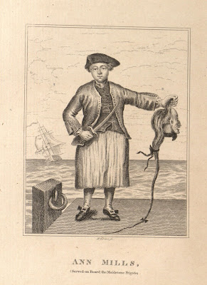 Today’s female at sea is the historical individual Ann Mills. She served on the frigate Maidstone in 1740, and managed not to become a pirate – just a sailor and soldier. A picture of the time shows an artist’s version of her, and it’s pretty. . . exciting.