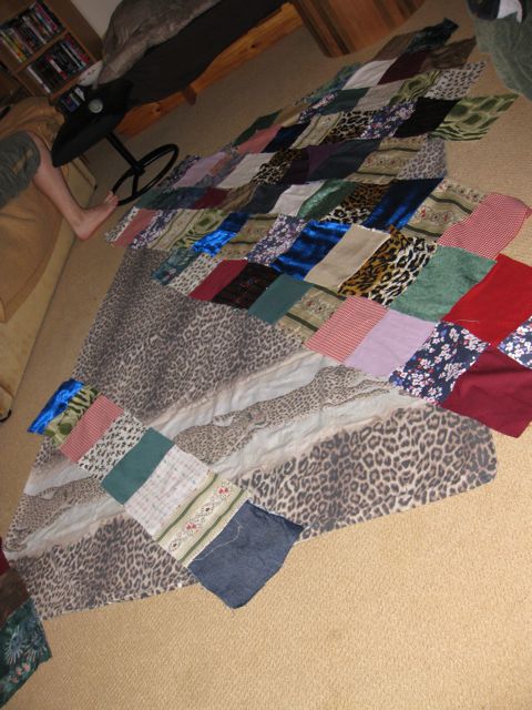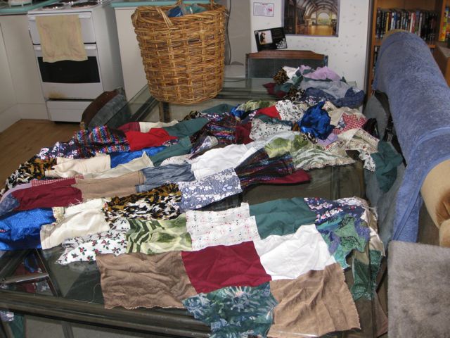 Today was the day to attempt to make something of them. Specifically, a pretend quilt. Some of the pieces have stories – my Year 10 formal dress (first in a dynasty of similar dresses, two others of which are also represented), a sarong, part of a woven bag from Indonesia, some curtains, some of the wrap my mum made me for my Year 12 formal, part of a cushion cover, etc.