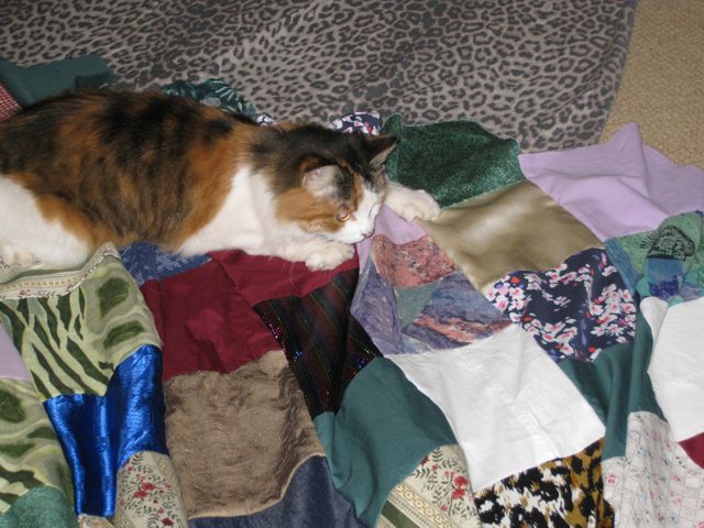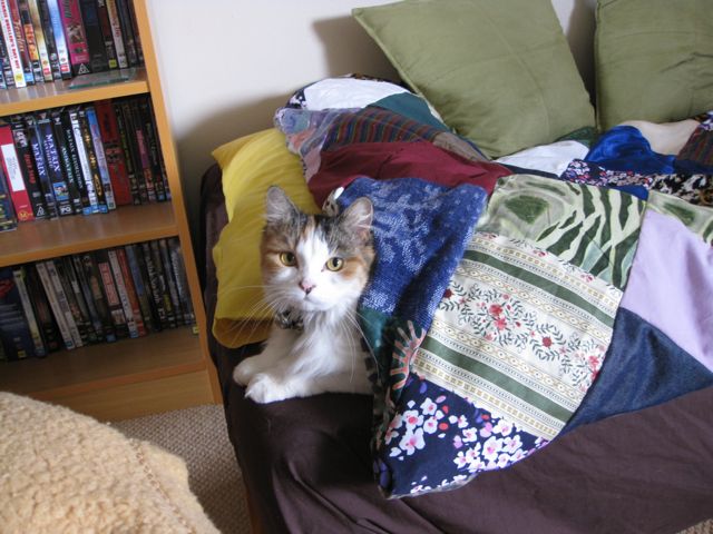 In other news, my cat likes the new quilt so much that she poked her head underneath and posed herself like so: