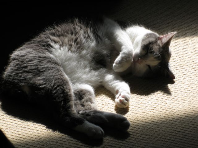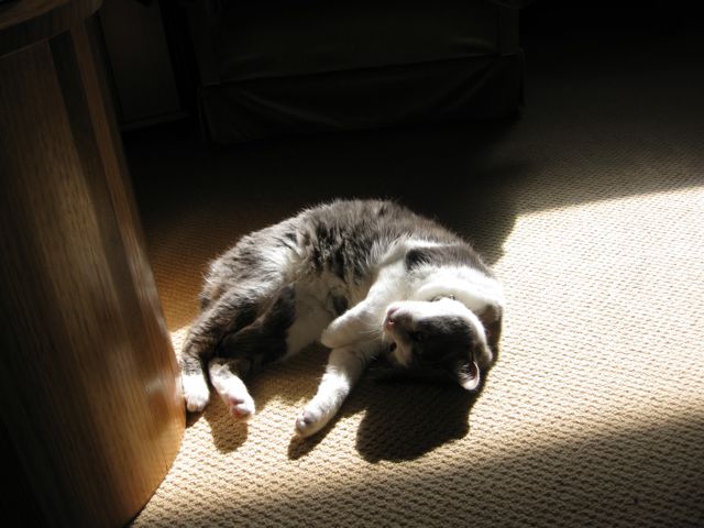 In the meantime: You’re familiar with my cat Ana, who spends her days (1) overturning my rubbish bin (2) falling off things, and (3) posing for photos. This is the other one, who spends her days glaring from the top of the cupboard, and meowring in annoyance if you dare to open the cupboard door. Every so often she feels like taking a little sun. Her name is Indah, and she is twelve years old. She is absolutely awake in these photos (deciding on a dignified indifference rather than her usual paparazzi-fighting technique of running away).