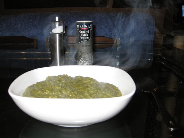 After roasting the pork chops (which had bones, which I gather is important) and letting them cool, I chopped off chunks of meat for later and boiled the bones and fat with more salt and pepper. When it was as pulverised as possible, I took out the solids and added the rest to the soup – which was, quite simply, boiled peas and lentils. Then I blended the green mix & stock mix together, and put it all back in the saucepan with the pork chunks. When it was all hot again, I ate it.