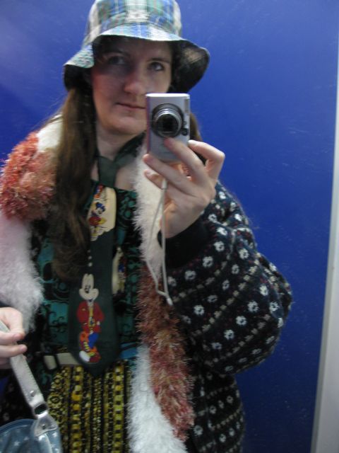 I am wearing shoes, a dress, a belt, a tie, two scarves twisted together, a jacket, a handbag (denim with silver stars), and a hat. Like a closer look?