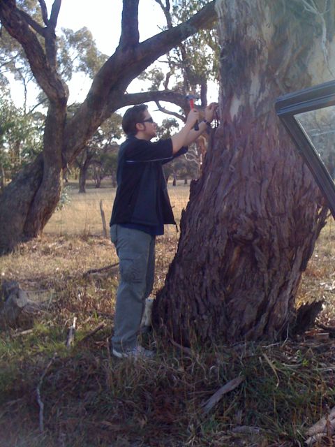 Gazing rapturously at one another (while also being careful not to nail CJ’s fingers to the tree in a bloody reminder of our special day), we did this: