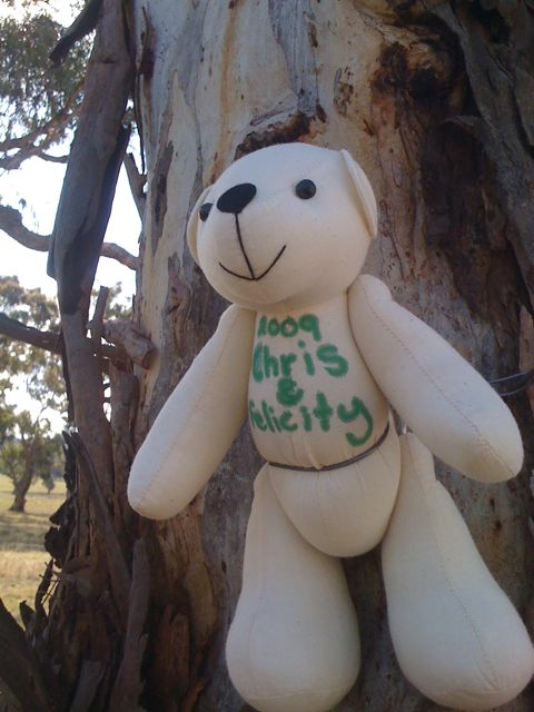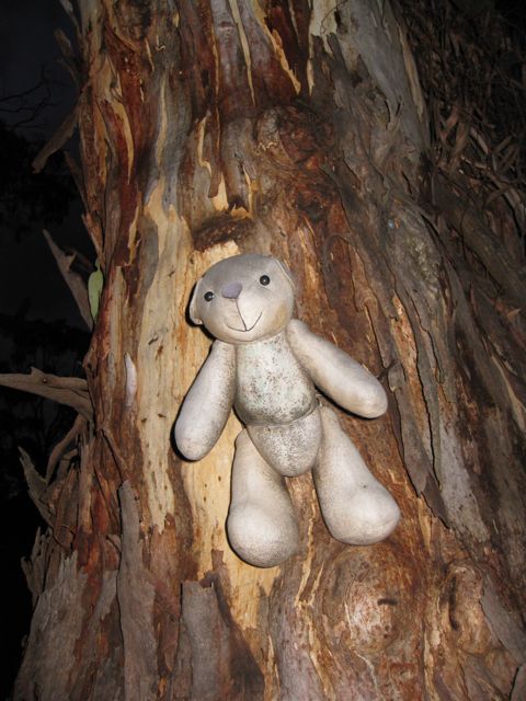 Along the way, while driving on the King’s Highway between Canberra and Bungendore, CJ delightedly pointed out dozens of teddy bears attached to the trees. Some were nailed on. Others were attached by the neck. Still others were wedged into narrow cracks between branches. All wore fixed expressions of delight.