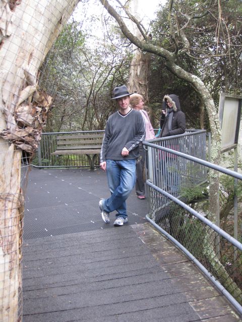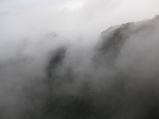 I admit that even while admiring the rainforest I was beginning to wonder what I’d committed to – the river didn’t look that impressive. Very soon we could all hear the rushing water – but it didn’t sound especially impressive either, muffled as it was by trees and mist. I was horrified when we rounded a corner and saw the railing of the viewing platform – and a wall of white. Too much mist! But no-one else seemed to be screaming and cursing, so I walked up to the edge and – pow! Nothing but air below me for 81 metres (yep, I looked it up) of sheer cliff. We stood and gaped for a while, and then we gaped some more. The mist cleared a little to show the other side of the gorge – and these mountains (I swear they weren’t there before).