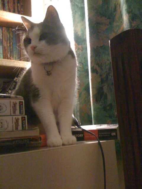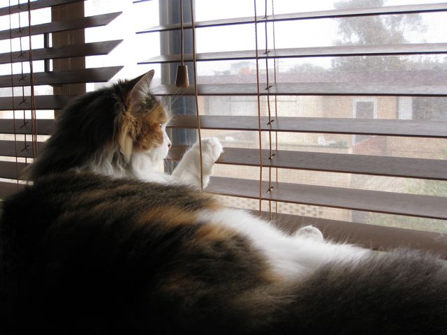 In other news, I took these two photos of my cat Ana spying on our neighbours (neither was posed, and the look in the second picture was a response to my picture-taking – after which she went back to work. . . watching. . .). I also had a nightmare about a killer robot last night. That was odd.