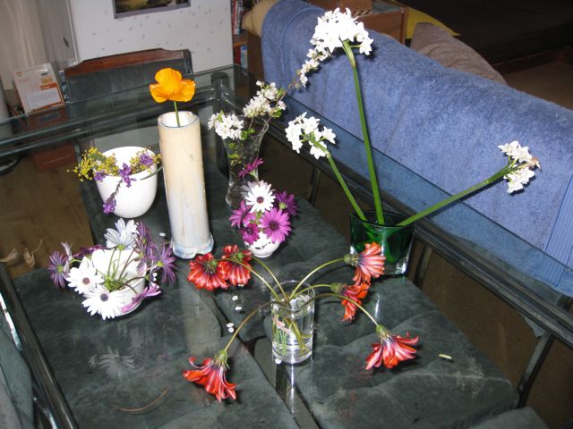 And this is where crime comes in. I stole these flowers from five different locations (my friend Ann may find the daffodils eerily familiar, but the other victims of my crime spree were all neighbours and/or strangers), generally leaving my car running to assist in the fastest possible getaway. I inadvertently collected several ants (both large and small) in my guilty haste, but since none bit me and the fuzz hasn’t come a-knocking, I feel I can confidently declare that crime pays.