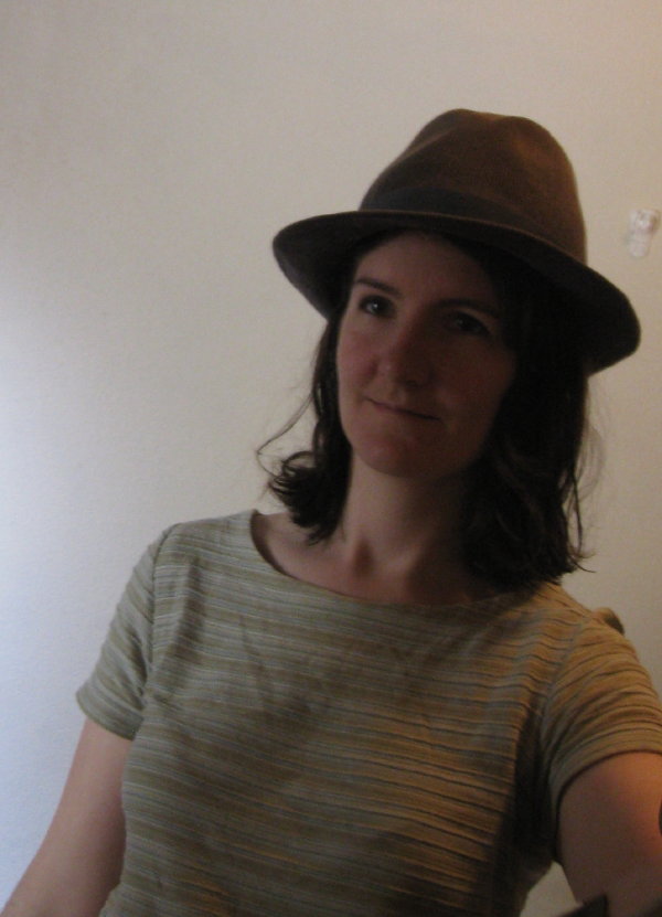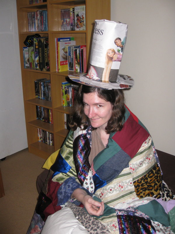 I wore this hat while watching “Gilmore Girls”, riding on my exercise bike, and hanging out washing. Then I realised the government agents watching me mustn’t know that I know they’re there. So I thought up the cunning disguise you see below (worn over the tinfoil hat):
