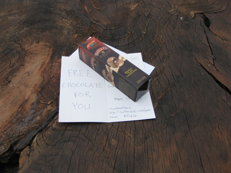 I even put this blog address on the card, figuring someone is more likely to accept free chocolate if they feel they’re being advertised to.