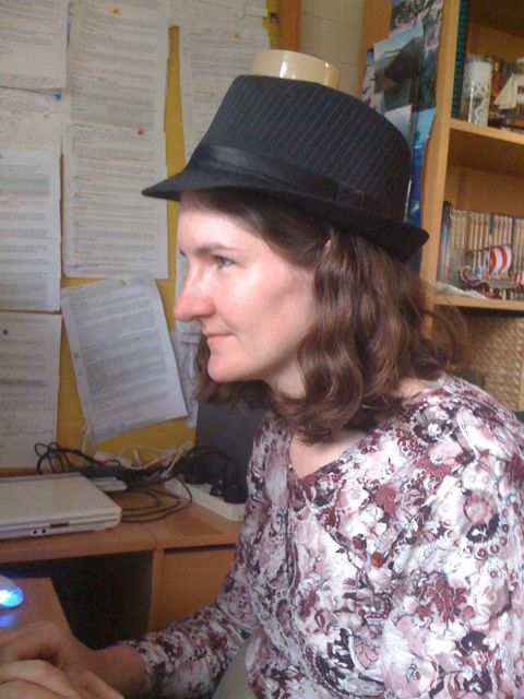 And here’s a random photo of me last Monday – the day of the 12,000 words (which, thank you, I did). During the day I also went shopping, went to work, and cooked dinner for five people. I wrote 1600 words while the five people were in the room (Miss Manners I’m not). One of them put their hat on my head, and CJ took this photo.