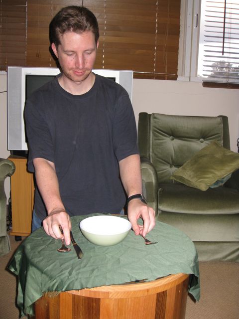 On the ratio of “least amount of work to most amount of results”, this scores VERY highly. I practised exactly once with non-fragile items, once with the (stoneware) plate and (metal) cutlery, and then set things up with the glasses for the video (they are glass glasses). CJ said, “Don’t you want to prepare a bit more first?” and I said, “This is way more interesting.”