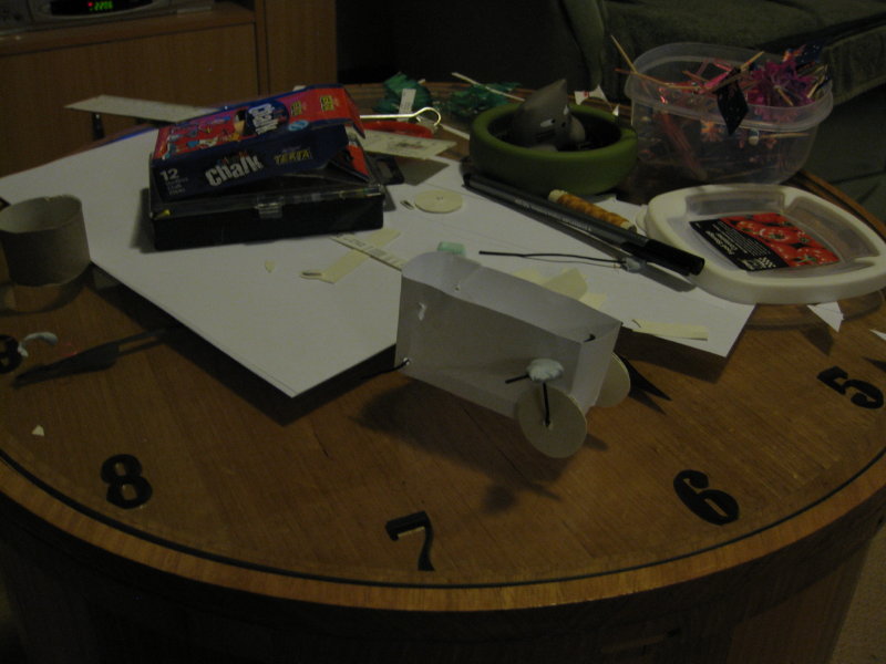 I messed around for a long while with paper, cardboard (from Lindt extreme orange packets, FYI), stickytape, paperclips, a metal skewer, and blue-tack (no time for glue! I’m inventing here!) and did make something capable of rolling (before I removed the back wheels, anyway).