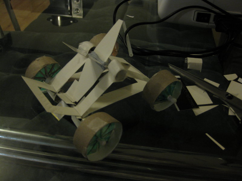 I realised I needed better wheels, so I started over – using a sliced toilet paper roll and several mangled cocktail umbrellas to great effect.