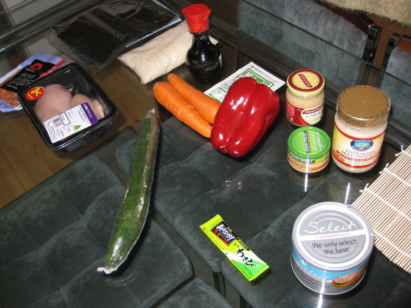 Fay gathered the ingredients: sushi rice, sushi powder (basically vinegar), nori (seaweed sheets), some fresh vegetables, soy sauce, chicken, tinned fish, mayonaisse, pickled ginger, and wasabi. All of the ingredients were on the shelves in a major supermarket (which apparently used to stock Asian mayonaisse, but doesn’t any more).