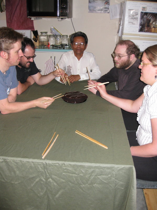 Inspired by being told that Chinese people eat cake with chopsticks, reader W suggested that I do the same. Since I ended up with a decent bunch of people at my house last night (my Indonesian uncle had sushi for the first time), I ordered them all to obey yet another peculiar whim “for the internet” (my aunt took photos and giggled).