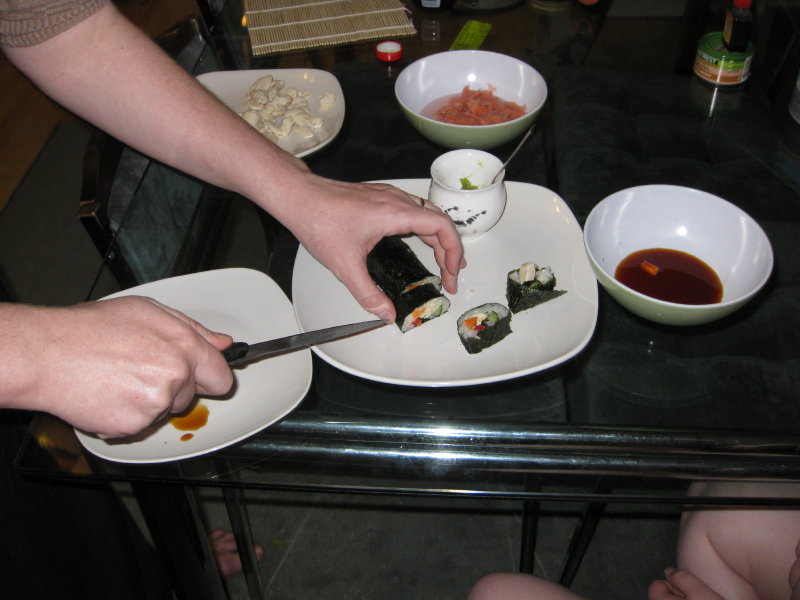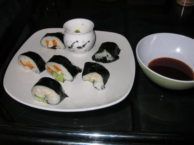 I laid vegetables long-wise, and pieces of chicken (thinly sliced), and rolled it up as tightly as I could, pressing down at the end so the empty bit of seaweed stuck to the roll. Then I sliced it.