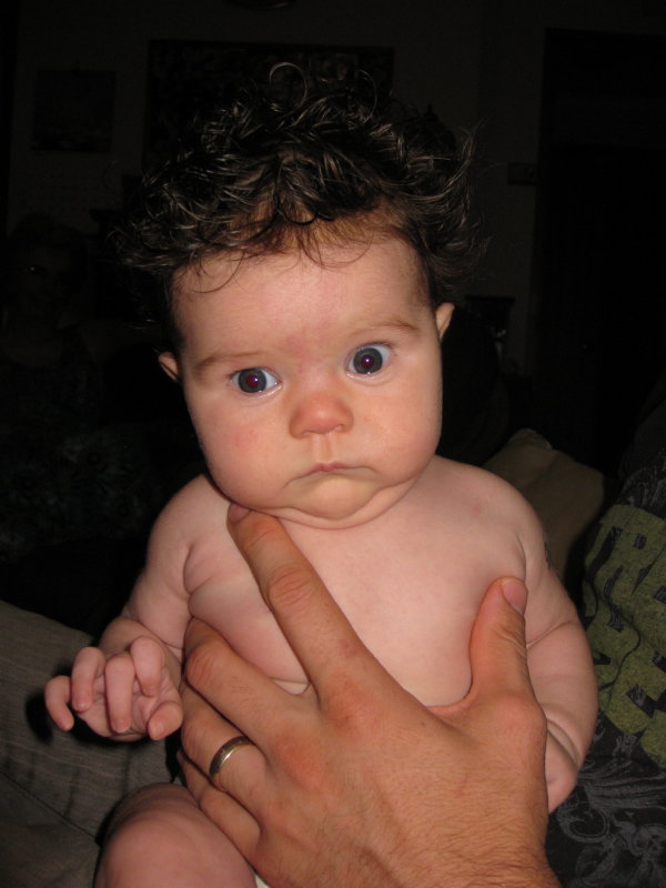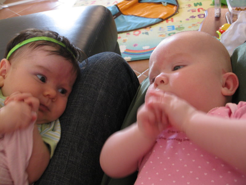 Today I introduced my 2-month old niece (she of the dark hair) to my friend’s 3-month old girl. They cast many suspicious looks at one another, and my friend’s baby kicked my niece in the head.