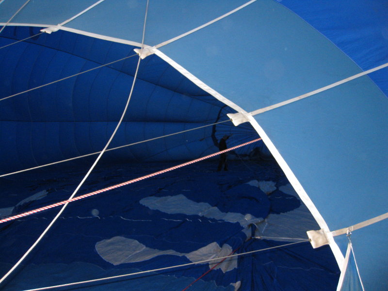 CJ and I held the envelope open while it was inflated with a powerful fan (only about half inflated, really). The pilot walked inside, checking the ropes to the vents on the top and side were lined up correctly.