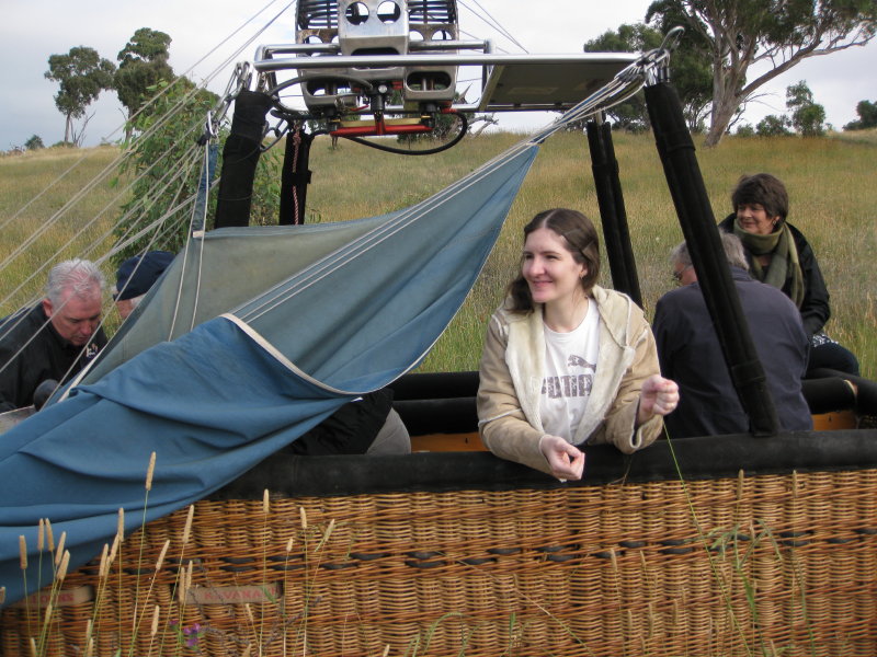 Fire! The air grew hotter and hotter until the balloon stood up, soon pulling the basket with it (with a little help from us). We climbed in over the sides. At this early stage, the burner was uncomfortably hot on the top of my head because it was on so much of the time.