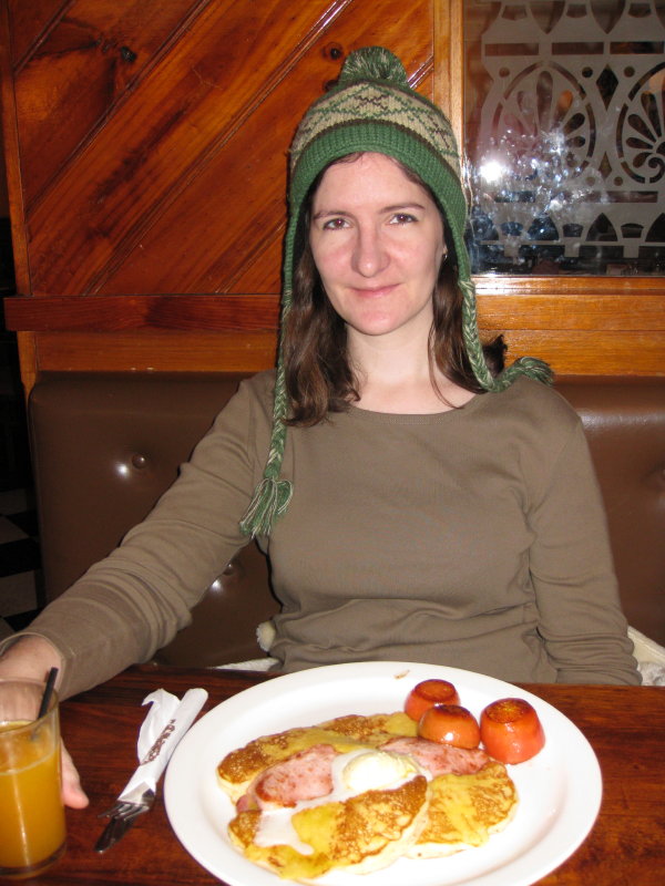 I had a “Red Dawn”, which consists of two cheese pancakes with rashers of bacon cooked into them, served with a giant scoop of butter (it looks like the sun at dawn, see?), and grilled tomatoes. (As you can see from photos taken this week, that beanie is staying firmly planted on my head until Spring.)