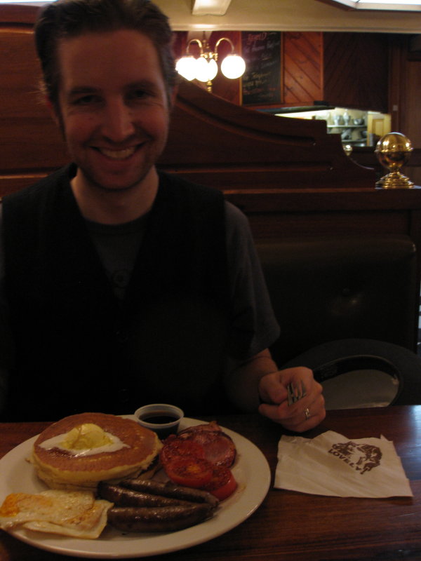 I didn’t finish the tomatoes (just empty vitamins). I did, however, steal some of CJ’s maple syrup – because although bacon and maple syrup is gross, when served with a pancake it’s sheer gastronomical genius.