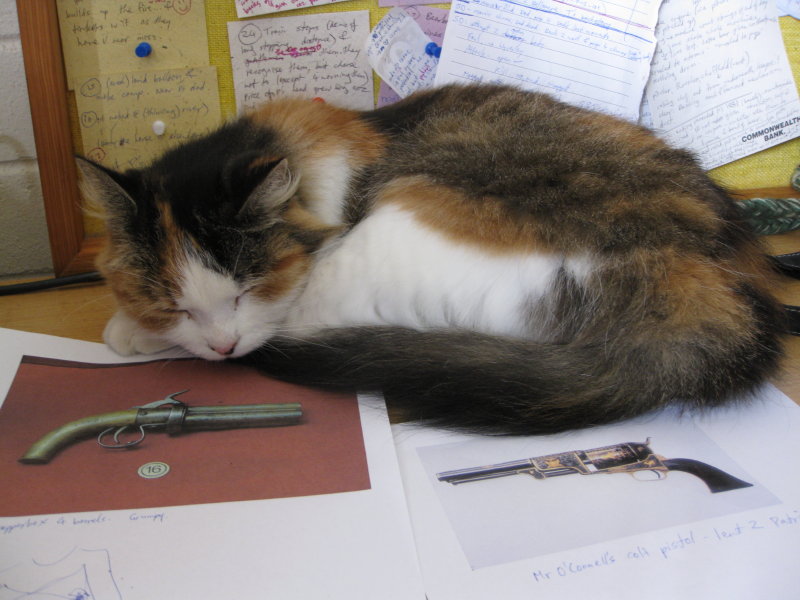 Today is day three of my writing binge, and I’m loving it. Ana decided to get in on the paperweight action (FYI, the gun on the left is a pepperbox, and the other is a Colt – the same type Ned Kelly used):