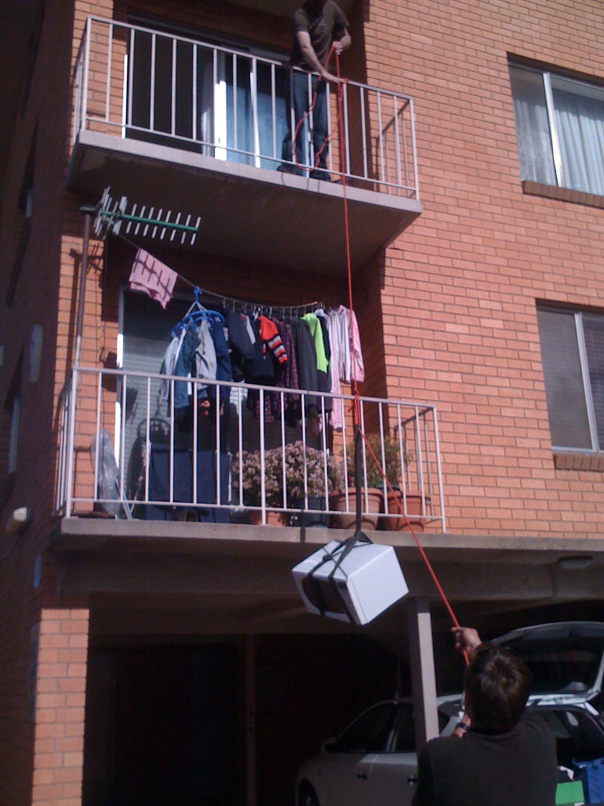 CJ and two other manly men helped her move in – scoffing at stairs, and making the move way more exciting by using the “direct route” (observe the couch cushion on the left):