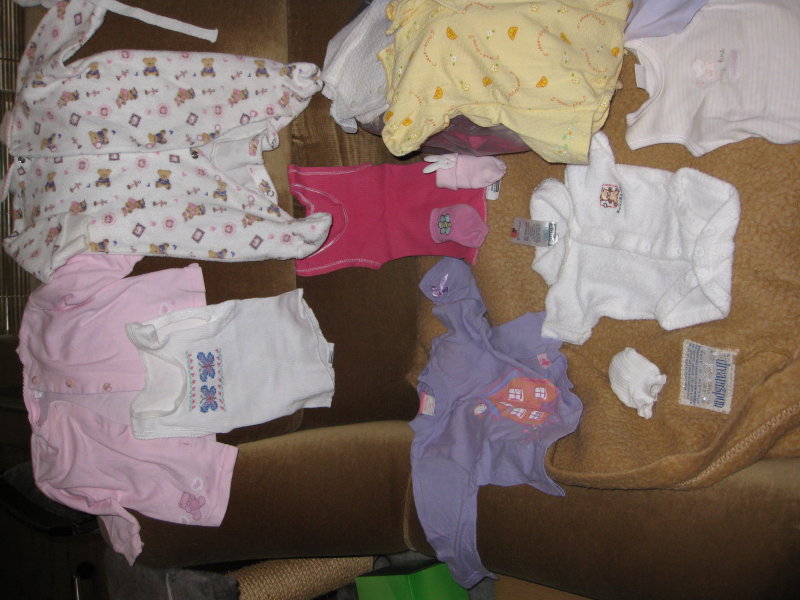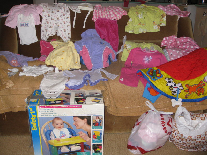 Some of my relatives and close friends have already given me various items, but it was the parents of a student of mine that decided to clear out their storage. . . and send soooo much sweet sweet baby loot my way. This is only the first section – a safety chair, a play mat, and a vast pile of girls’ clothing*.