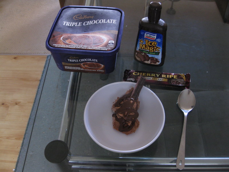 I began with triple chocolate Cadbury ice cream – chocolate ice cream with real chocolate chips and ribbons of chocolate sauce throughout.