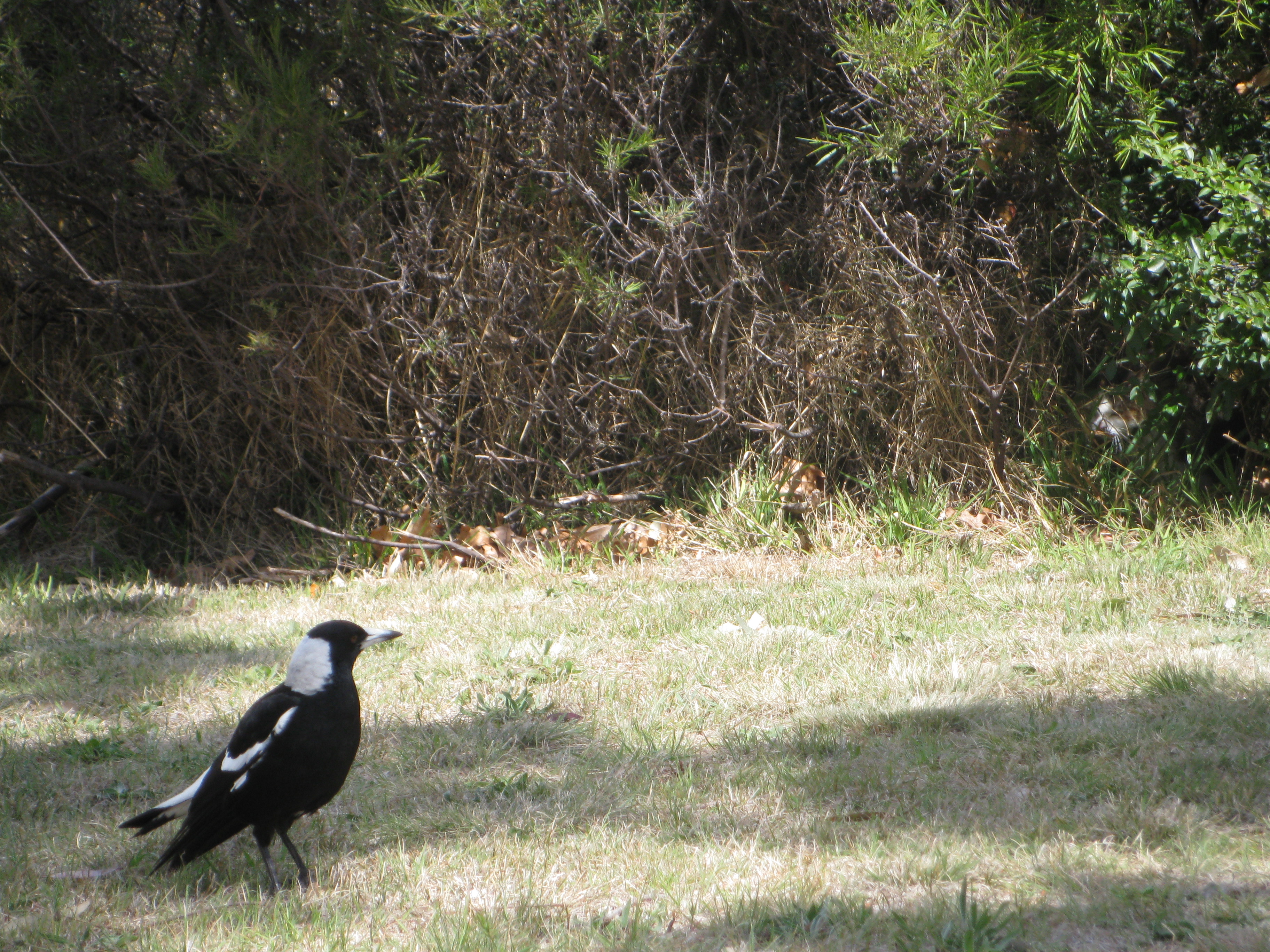 That was when things got interesting. The bird was a young magpie. Two others immediately swooped in to cordially suggest that Ana desist from her attentions. She ran and hid in a bush (you can just see her face on the right).