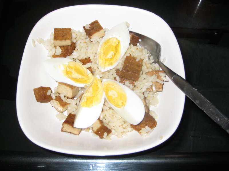 In over two and a half years of marriage, CJ and I have never once eaten tofu. Every so often I make a dodgy fried rice with whatever is in the fridge – usually ham and eggs, with sugar and soy sauce for flavouring. This week I tried something new. I cooked coconut-flavoured rice by adding a cup of coconut milk to the uncooked rice instead of water (then stirring it a few times as it cooked, rather than just letting it go). It tastes brilliant. I fried the results with Chinese-style honey soy tofu (a pack of it from a supermarket shelf – in the same aisle as cold meats and cheese), and topped it with boiled eggs. We then added soy sauce to taste.