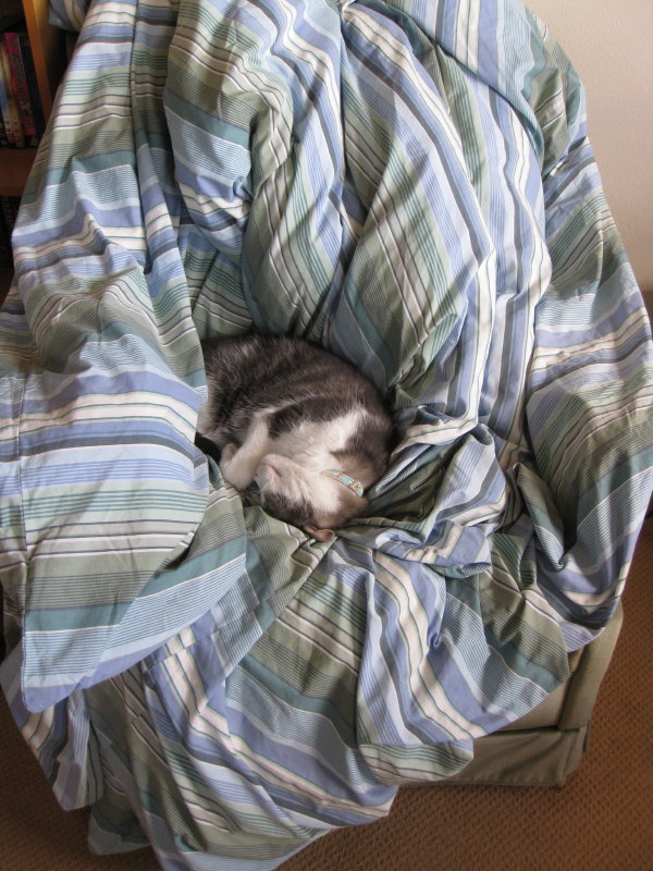 I did have a peculiar incident yesterday. When I woke up, I stretched – like a mad fool. The muscles in my left leg snapped into a bad cramp – and after the initial severe pain wore off it stuck around (in fact it’s not entirely gone now). I literally crawled to the bathroom and was able to limp back. Unfortunately, lying down made it much worse and when I tried to get up an hour later CJ had to come and massage me before I could turn over (somewhat necessary in order to get my legs to the floor). I limped severely all day, but luckily I didn’t need to drive anywhere. Although it was painful, it had plenty of novelty value so I kind of enjoyed it.
