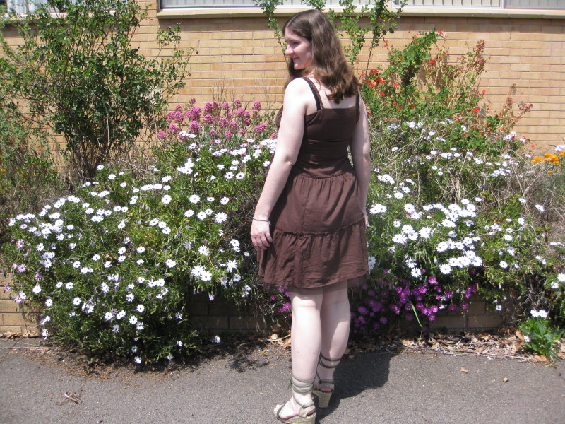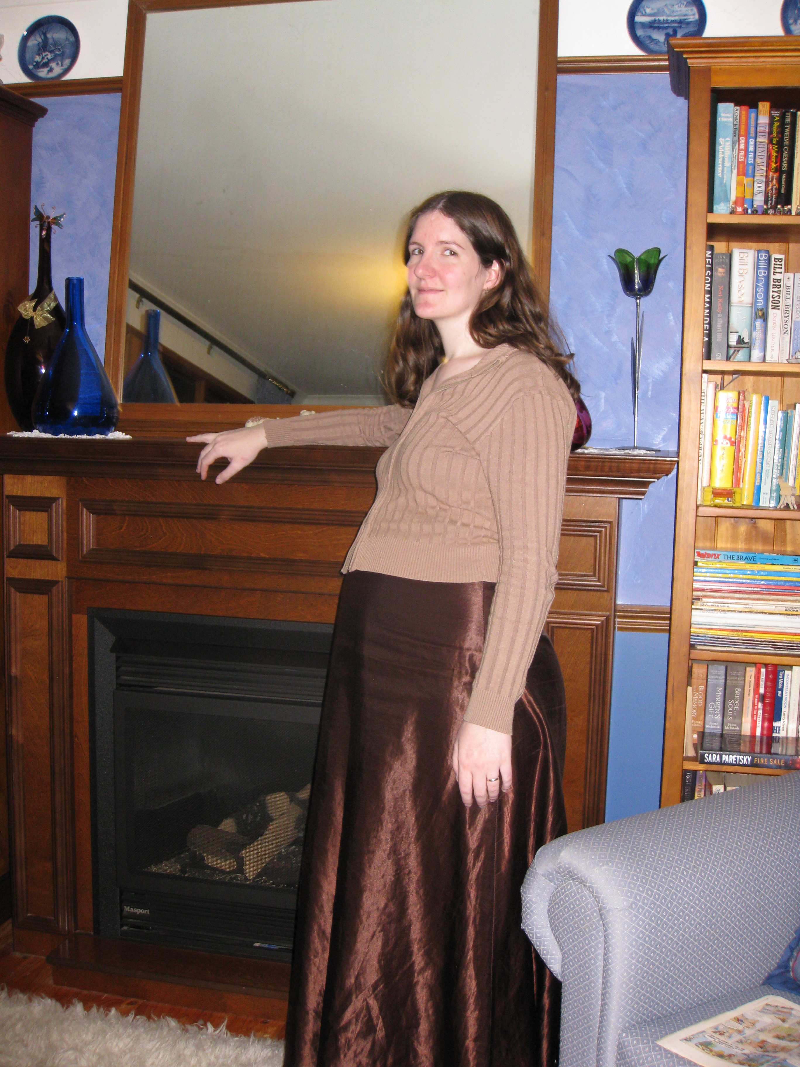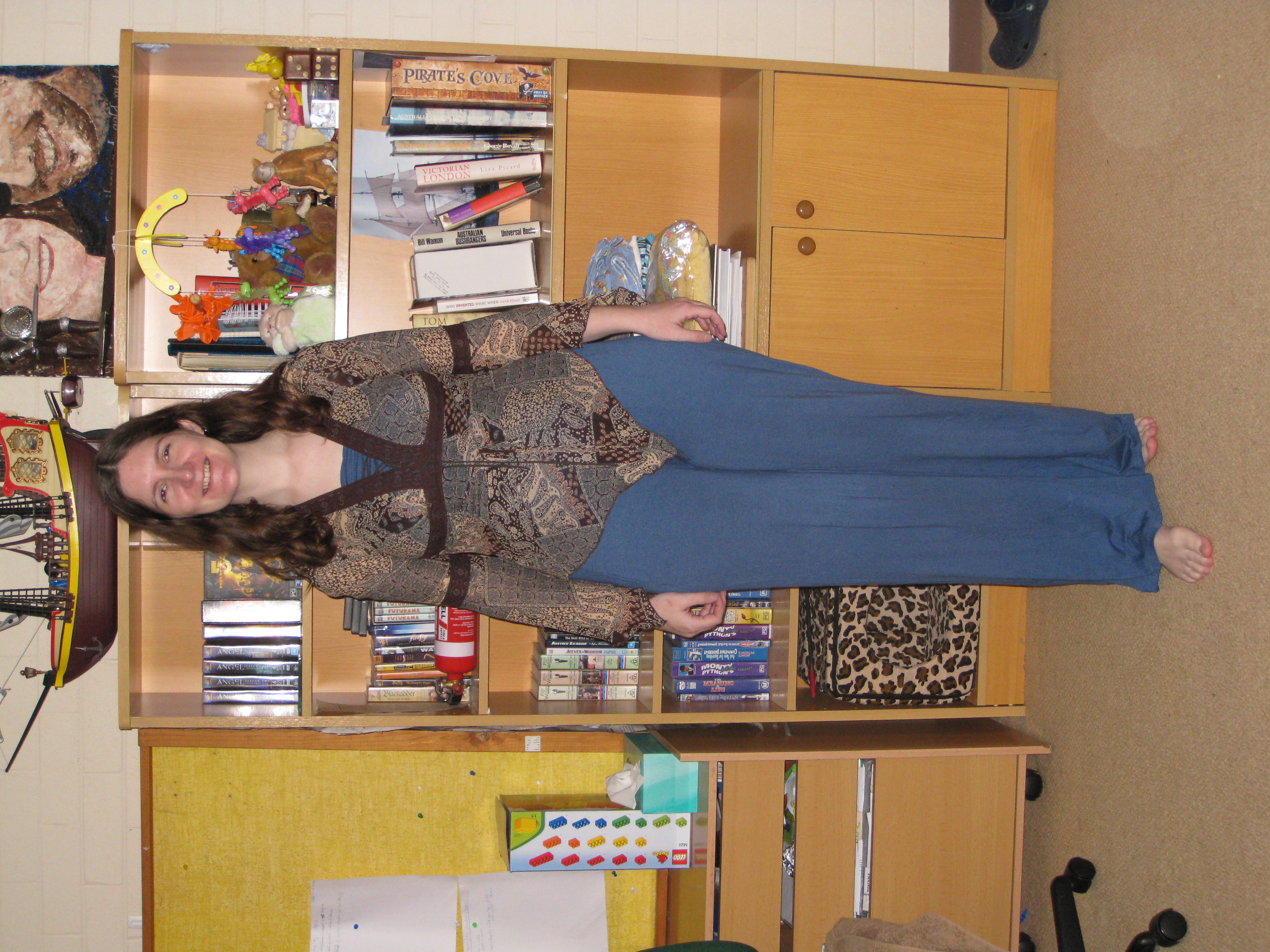 26 weeks. The pattern on this skirt (and the viscosity of the artificial material) made me look much more pregnant instantly. This was the last of my long skirts to still fit, and it did mean that it wasn’t ankle-length any more (always sad – the reason I made my own skirts is that shops never get my length right. Fie on three-quarter length!) At this point, the brown top was the only good top for me to wear, because all other tops just rode up my belly and bunched unnattractively below my bust. Because any trace of elastic (or worse, non-elastic binding) made me sick, this was the last time I wore anything that wasn’t a dress.