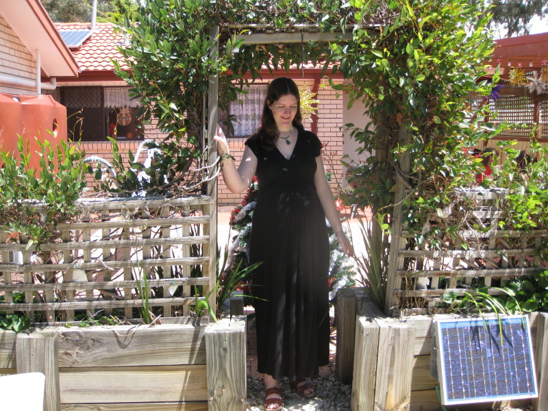 These three photos were all taken at 25 weeks. The corset-style front lacing looked excellent about two weeks before this photo was taken – giving me back the illusion of an hourglass figure. I’d deliberately bought a jumpsuit in a larger size, but it still had a thin line of waist elastic, which meant this was the last time I was able to wear it (because of nausea – it still fit, but I kept automatically pushing the waistband higher, which wasn’t a good look). The golden dress is useful shape-wise in that it bares my arms and legs (which at this stage of the pregnancy were still roughly as they were) and is tight across the chest (unfortunately too tight, in this case, but the theory was good):
