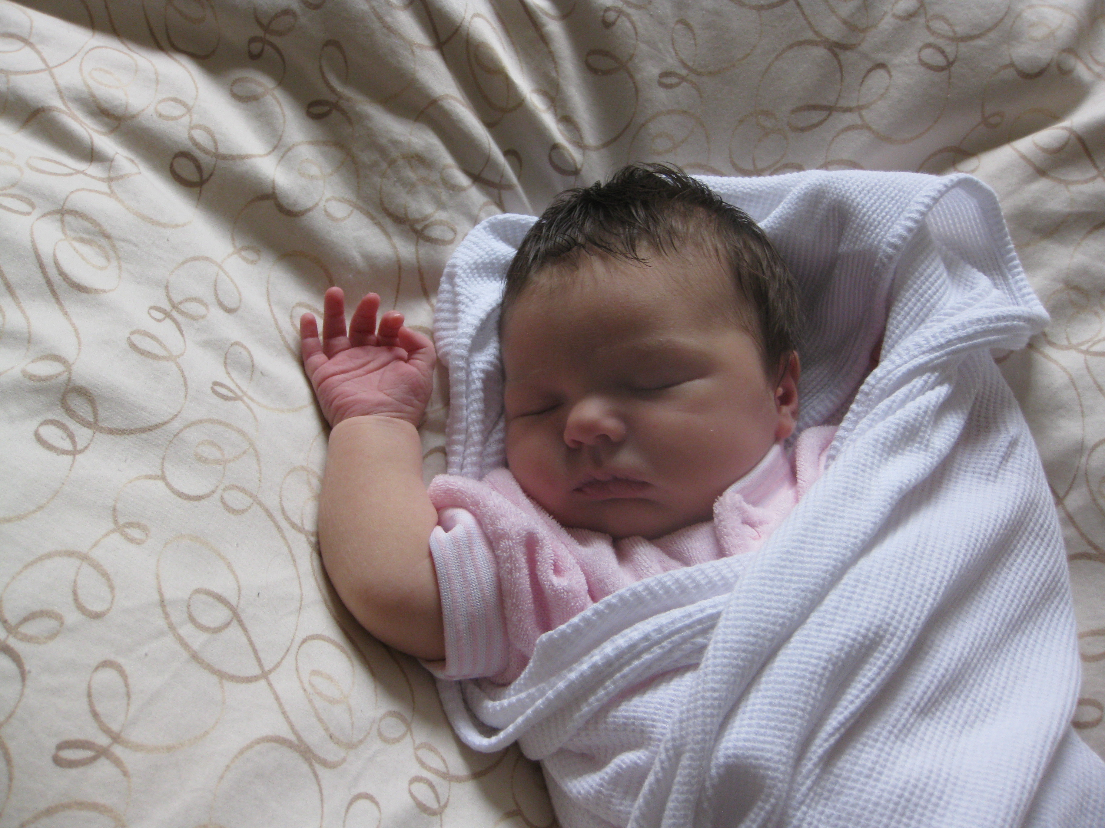To be fair, Louisette is one of the easiest babies in the world. She literally sleeps for twenty hours a day – we’ve barely seen her open her eyes, and she even breastfeeds with her eyes closed (the gorgeous photo below was taken yesterday, five days after the birth – it was the second time her eyes were open, and the first time she met my gaze). She has been grumpy (“arsenic hour” as it’s called – when a baby cries for no reason, often at around the same time each day) exactly twice. Taking her to China in a couple of months is going to be a breeze (I was terrified I’d end up taking a colicky baby on a nine hour flight, since I’ve heard several horror stories of colicky newborns from both sides of the family). She had a gunky eye which looked like it might be infected, but we gave her some drops and it’s already cleared up (which is good, coz it was gross).
