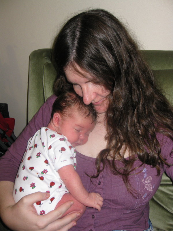 Breastfeeding is continuing to improve, and I have the pulsating breasts to prove it (and now you know what having milk come in feels like). The midwife advised me to cut down on formula and “see what happens” (ie signs of hunger, signs of dehydration – that is, less wet nappies – and so on). Since her birth I’ve been keeping extremely careful records of when she feeds (and how long), all her nappies (and what. . . er, type of nappy), and when she’s particularly tired or genuinely awake (and if it’s grumpy or happy wakefulness). She has about seven feeds a day, and it used to be a breastfeed followed by a bottle. More and more of her feeds are breast only now (it is VERY clear when she is still hungry), and there is a clear pattern of one less bottle each day (smaller bottles, too). At this rate, she will be on breastmilk alone within three days! She was weighed on Monday and had gained 200 grams, which clearly indicated she is flourishing, not starving.