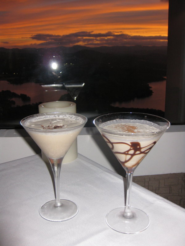 The drink on the left is a masquerade, which CJ drank (cream, butterscotch schnapps, and creme de cacao). On the right is mine, featuring Baileys and vanilla vodka.