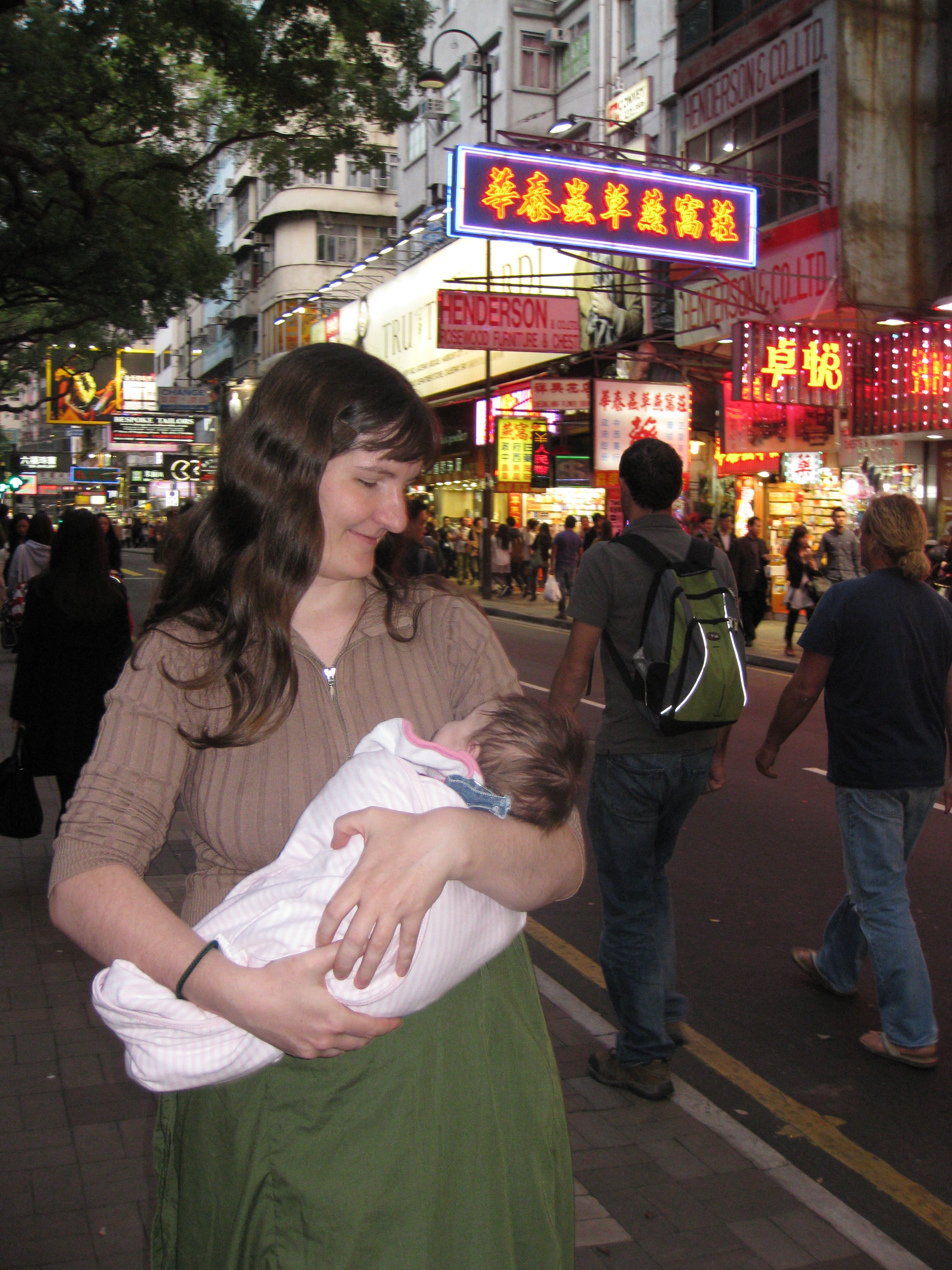 Wow. Hong Kong and two months old. Louisette is doing amazingly well, although of course she has some bad times. She keeps getting super tired, but everything is so INTERESTING she gets all excited and wakes up. When breastfeeding (or bottle feeding for that matter) she lacks a certain focus, too, which is a problem.