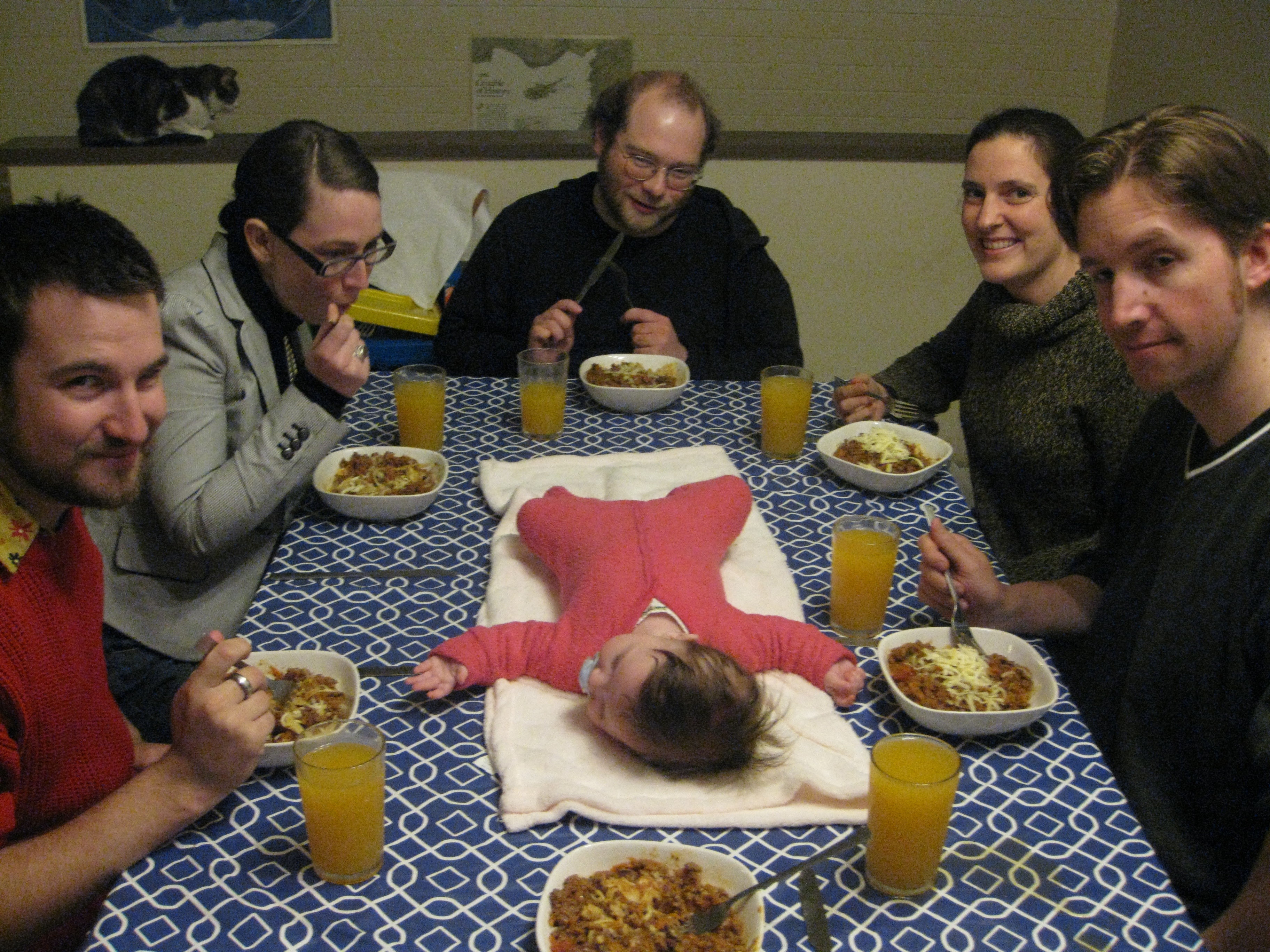 PS: Long before Louisette was born, I planned to lay something on our dining table so I could lie her down and be at her level without crawling around on the floor. It worked very nicely when CJ and I had friends over last Monday – but the macabre overtones weren’t lost on any of us.