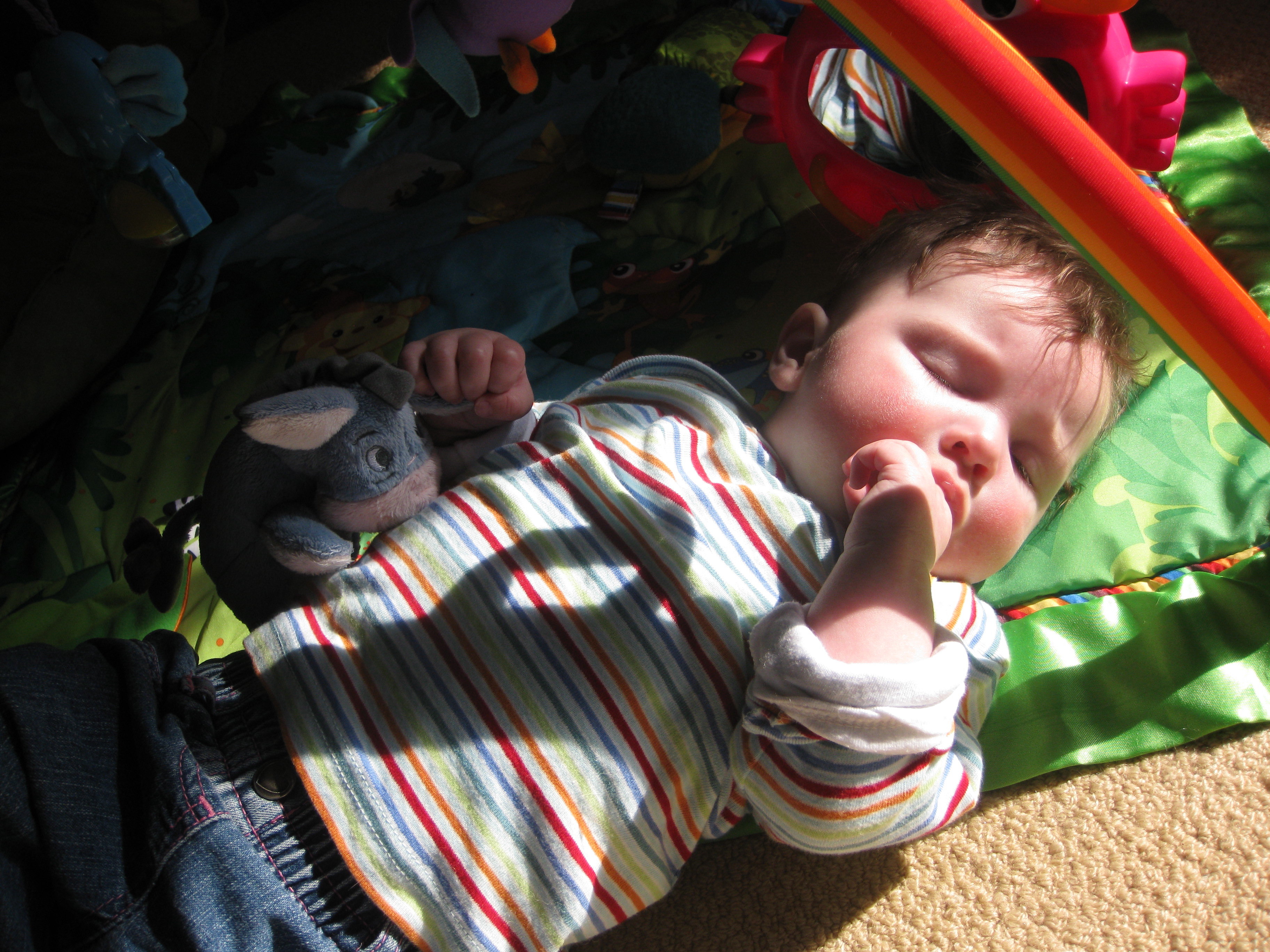 This week CJ and I decided on a toy we intend to be Louisette’s favourite, and (once the danger of SIDS has passed) sleep-time toy. She really liked a particular monkey toy because it was a comfortable size, easy to hold on to, and nice to chew on. I didn’t like the monkey’s face, so I used it as a model to find something that had it all: no TV brand name, washable, portable, and suitable for a five or a fifteen-year old as well as a baby. It took a long time, but we found Eeyore, and although it’s been less than a week Louisette is already fond of him (we bought three so the creation of dependence doesn’t horribly backfire when Favourite Toy is lost out a car window or has just been thrown up on and needs a wash). As parents, some of your plans come to naught – but some do actually work.