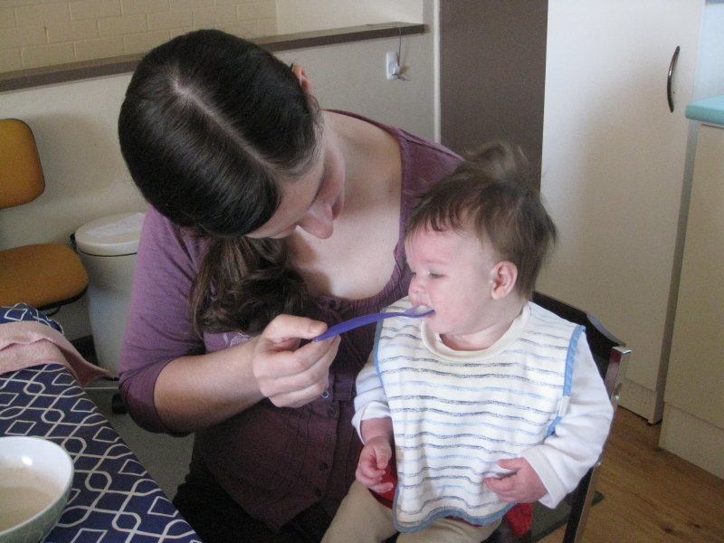 After about a month of intense anticipation, CJ and I sat down last Saturday (the first Saturday after Louisette passed the current recommended minimum age of four months) to give our little girl her first taste of food. Mmm. . . rice cereal mixed with watered-down formula. . .