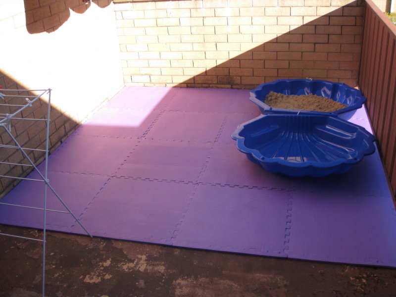 Last weekend I turned any drowning hazards (saucers under pots) upside down, moved climbing hazards (pots again) away from the two-storey drop, braced the glass table against two walls for a teensy bit of stability, swept away as much dirt and peeled paint as possible, laid down comfy foam for lying/crawling/falling on, and organised our sandpit/paddle pool (the pool is usually empty and turned over as a lid).