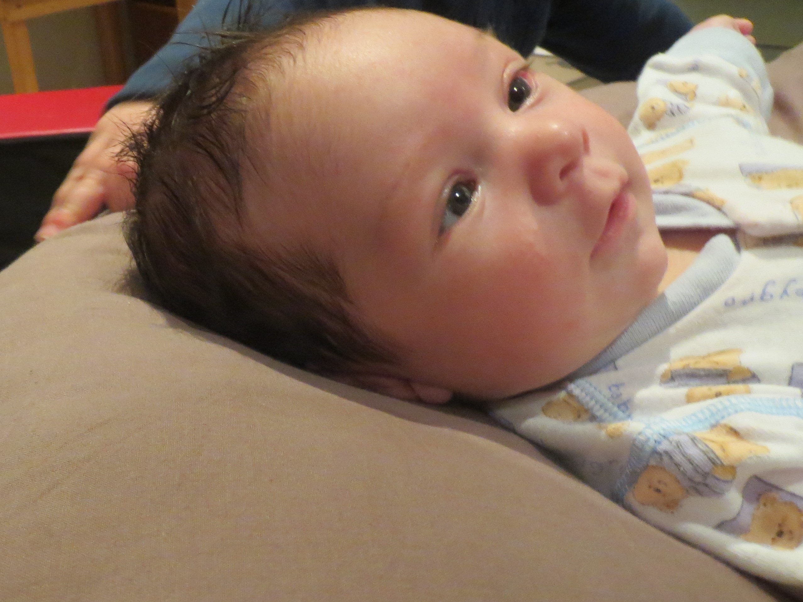 TJ was oh so perky this morning, and has started to do really well in the bouncer. . . rather than always in our arms (unless he’s deeply, deeply asleep). He even fell asleep in it today, which is a first – especially from a wide-awake start.