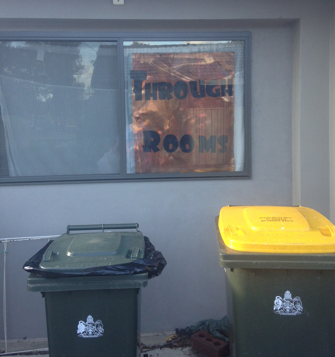 This photo probably isn’t as exciting to you as it is to me. It’s not, as it might seem at first glance, a photo of our rubbish bins. The “Through Rooms” sign is metallic paint on a sheet of copper. We will eventually finish the other side, and the whole thing will say: