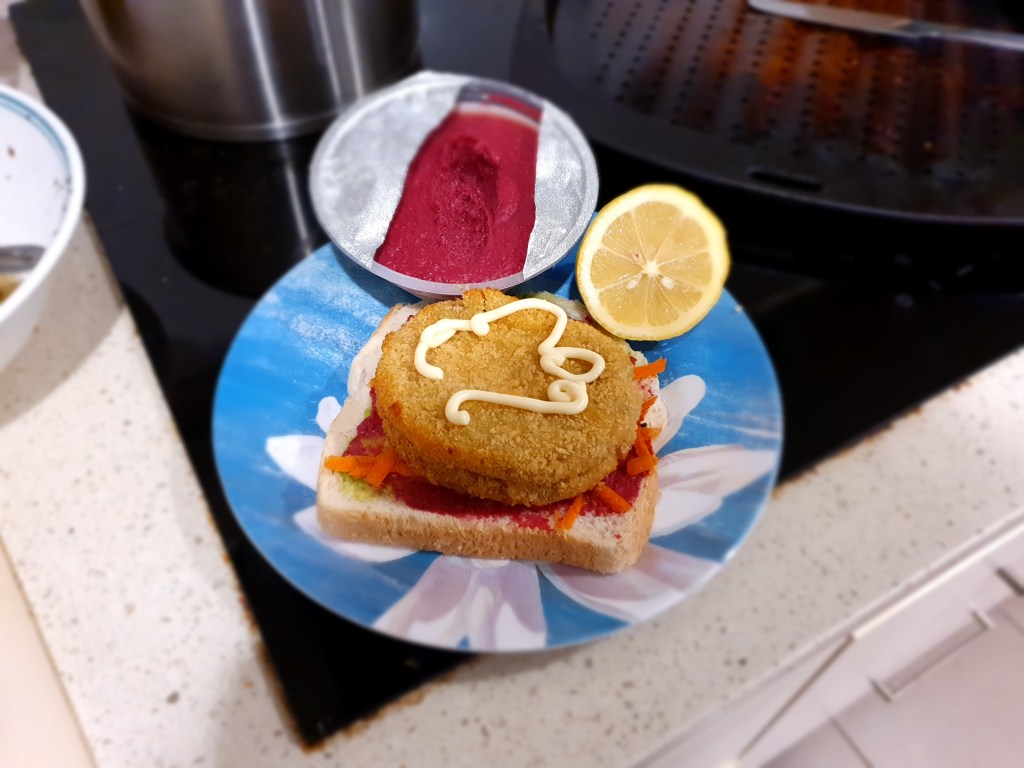 I have made a sandwich with fresh avo, freshly-squeezed lemon, freshly-grated carrot, a sweet potato & pumpkin patty, beetroot hommus, and Asian mayo.
