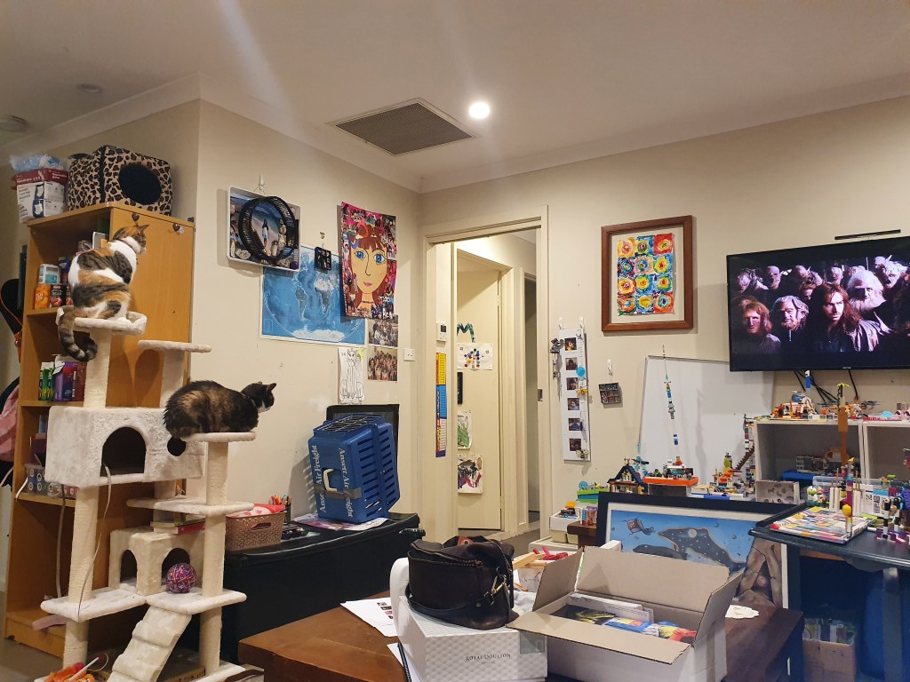 The cats are watching “Goblin Town”. Girls, you picked the absolute worst part of the trilogy. I’m actually glad it’s happening now, because I wasn’t sure which movie this segment was in. Now I can get it over relatively quickly instead of dreading it for many hours.