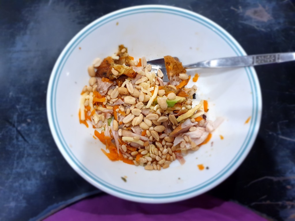 Last night I ate a freshly-roasted chicken salad with avocado, grated carrot, pine nuts, sesame seeds, and fried onion.