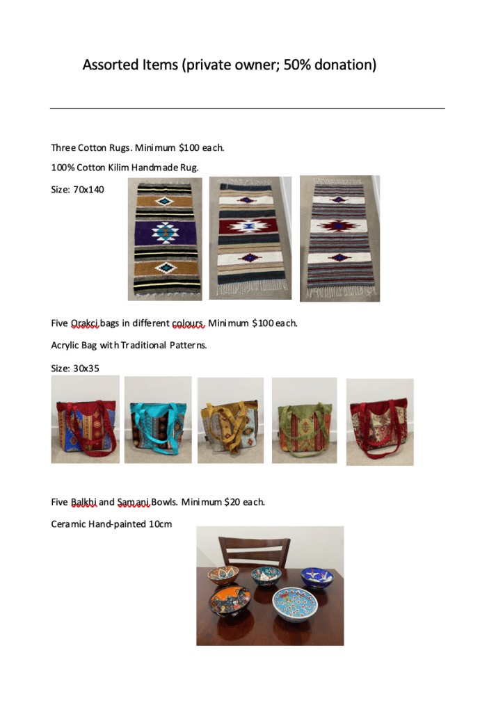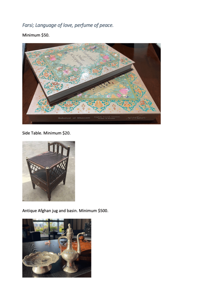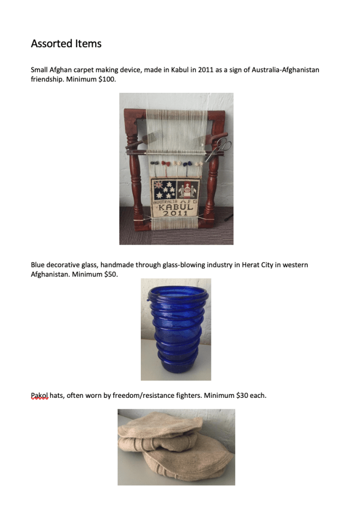 I organised the silent auction including loads of amazing art, handicrafts, books, antiques, collectables, and miscellaneous items. There are plenty of Afghan treasures in the mix.
